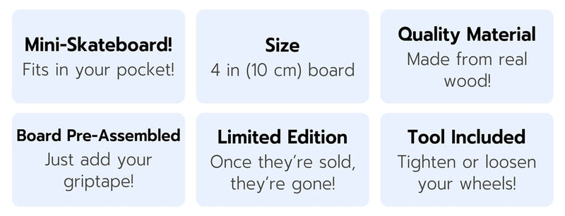 • Pocket-Sized. A real mini skateboard you can shred anywhere! Countertops, desks, during recess, you name it. Fits right in your pocket for nonstop tricks on the go!