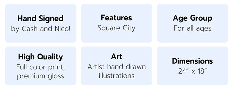 The Square City Poster is designed to bring the fun and excitement of Cash & Nico's YouTube world (Square City) right into your home! This vibrant 24” x 18” (61cm x 46cm) poster will add a splash of color and be the perfect addition to any Cash and Nico fan's bedroom or gaming space.